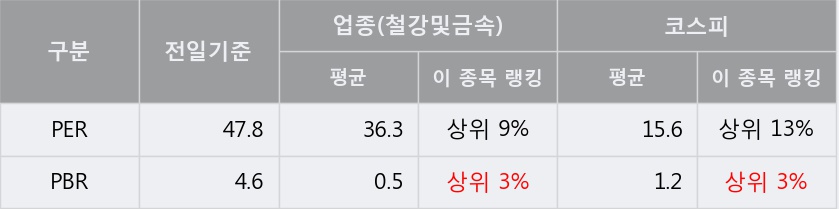 전일 종가를 기준으로 이 종목의 PER는 47.8배, PBR은 4.6배이다. PER는 철강및금속업종의 평균 PER 36.3배 대비 +11.5배 높은 수준으로 업종 내에서 상위 9%에 있고, PBR은 철강및금속업종의 평균 PBR 0.5배 대비 +4.1배 높은 수준으로 업종 내에서 상위 3%에 위치한다. 보통 높은 PER는 기업의 높은 이익증가율에 대한 시장의 기대가 반영된 것으로 해석될 수도 있다.