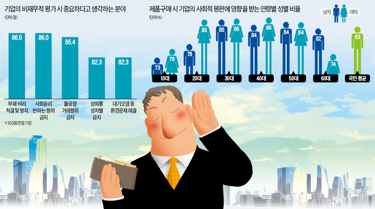 이는 한국경제신문이 글로벌 시장조사업체 입소스, 국내 최대 온라인 패널조사 기관 피앰아이와 함께 진행한 ‘2019 한경-입소스-피앰아이 기업소셜임팩트 조사’에서도 확인됐다. 국내 소비자들은 사회 윤리에 반하고 불공정 거래를 한 기업에 가차 없는 ‘혹평’을 했다. 사회공헌 등 긍정적 활동보다는 부정 비리 등 이슈에 민감하게 반응했다. 이 같은 소셜임팩트에 가장 민감한 층은 30~40대 여성들로 나타났다.