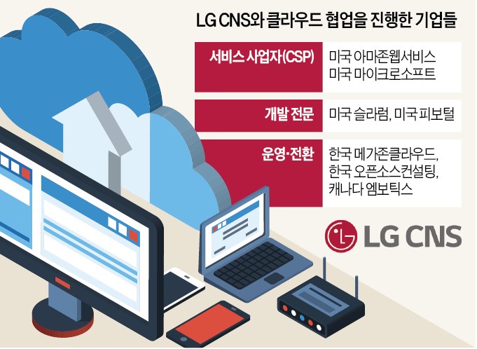 최근 LG CNS는 국내외 업체들과 적극적으로 협업하고 있다. 글로벌 클라우드 서비스 사업자(CSP) 부문에선 미국 AWS, 마이크로소프트 등과 함께 일한다. 클라우드 운영·솔루션 분야에서는 캐나다 엠보틱스, 미국 슬라럼 등과 손잡았다. 오픈소스컨설팅, 유엔진, 비욘드어드바이저리 등 국내 클라우드 강소기업과도 파트너십·지분투자·인수합병(M&A) 등의 협업을 진행 중이다.