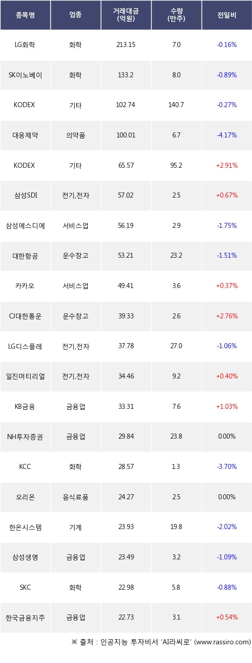 KODEX 코스닥150 레버리지, 삼성SDI, 카카오 등은 전일 대비 주가가 상승했고, LG화학, SK이노베이션, KODEX 200선물인버스2X 등은 주가가 하락했다.