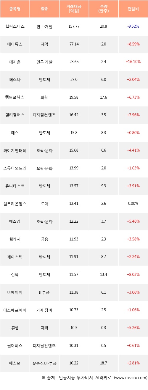 기관 투자자의 순매수 상위 20개 종목은 헬릭스미스, 메디톡스, 메지온, 테스나, 켐트로닉스, 멀티캠퍼스, 테스, 와이지엔터테인먼트, 스튜디오드래곤, 유니테스트등이다.