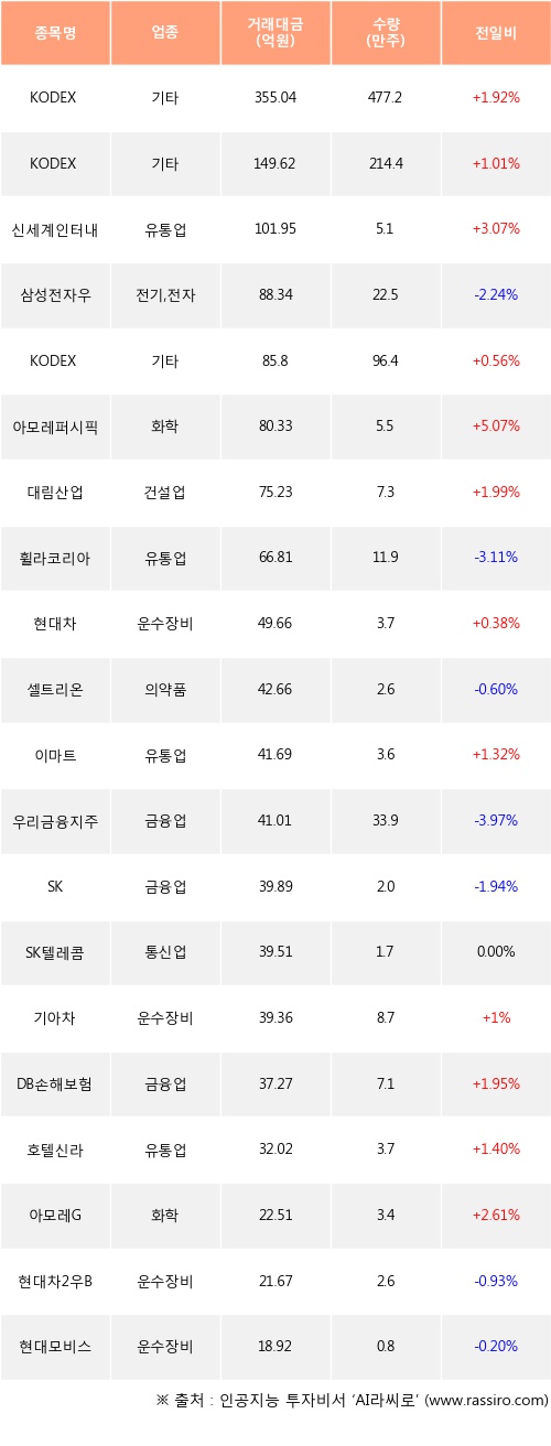 KODEX 200선물인버스2X, KODEX 인버스, 신세계인터내셔날 등은 전일 대비 주가가 상승했고, 삼성전자우, 휠라코리아, 셀트리온 등은 주가가 하락했다.