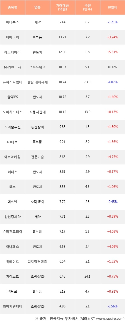기관 투자자의 순매수 상위 20개 종목은 메디톡스, 비에이치, 에스티아이, NHN한국사이버결제, 퓨쳐스트림네트웍스, 원익IPS, 도이치모터스, 오이솔루션, KH바텍, 에코마케팅등이다.