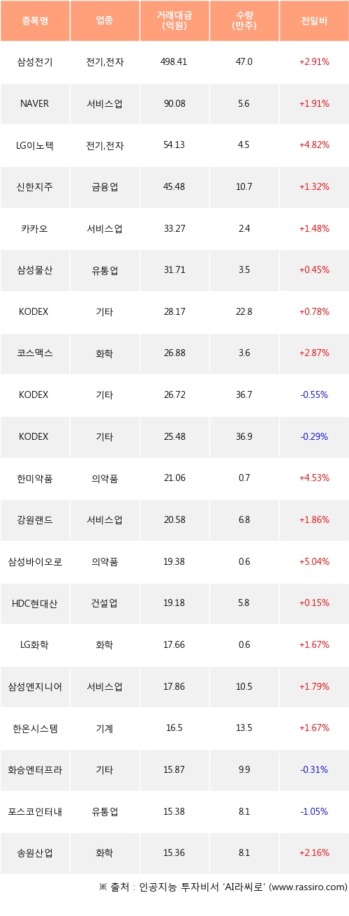 삼성전기, NAVER, LG이노텍 등은 전일 대비 주가가 상승했고, KODEX 200선물인버스2X, KODEX 인버스, 화승엔터프라이즈 등은 주가가 하락했다.