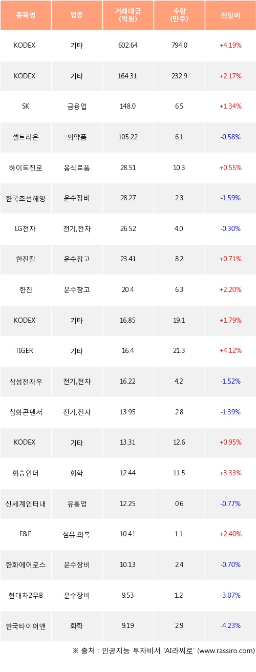 KODEX 200선물인버스2X, KODEX 인버스, SK 등은 전일 대비 주가가 상승했고, 셀트리온, 한국조선해양, LG전자 등은 주가가 하락했다.