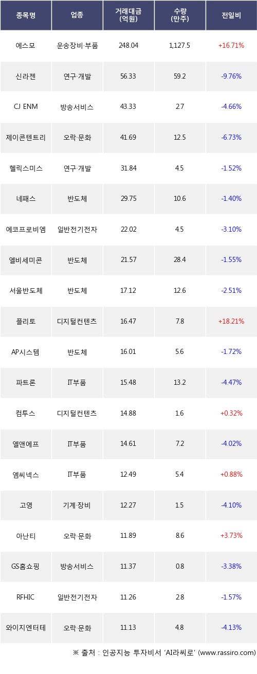 기관 투자자의 순매도 상위 20개 종목은 에스모, 신라젠, CJ ENM, 제이콘텐트리, 헬릭스미스, 네패스, 에코프로비엠, 엘비세미콘, 서울반도체, 플리토등이다.