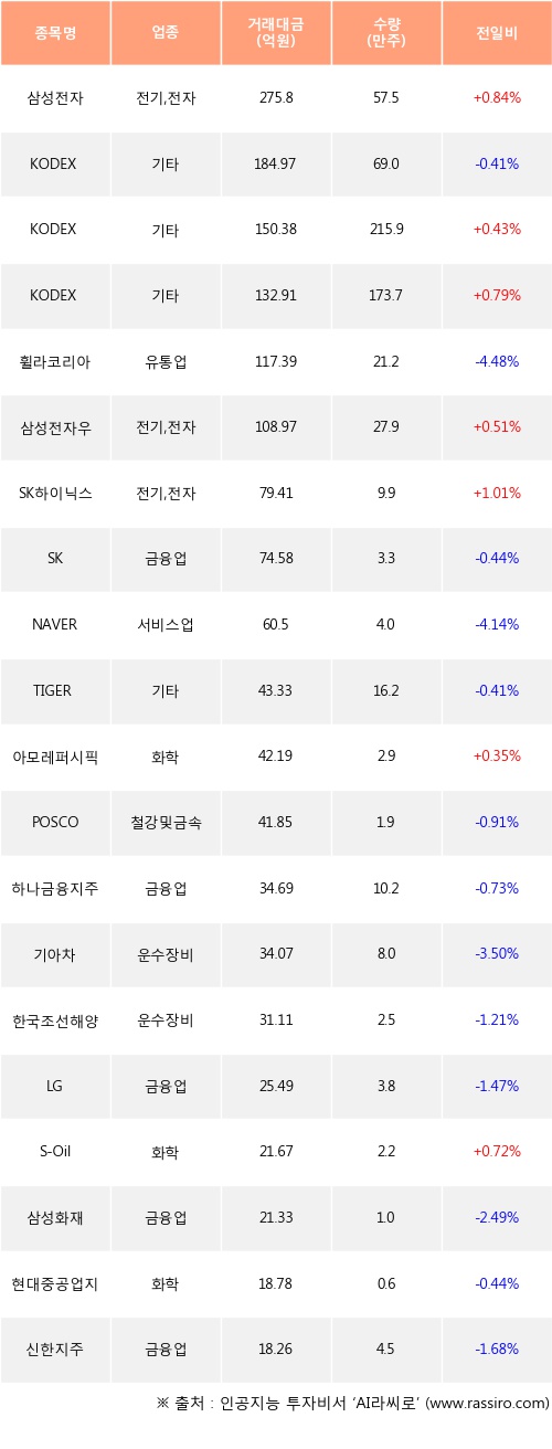 삼성전자, KODEX 코스닥150 레버리지, KODEX 200선물인버스2X 등은 전일 대비 주가가 상승했고, KODEX 200, 휠라코리아, SK 등은 주가가 하락했다.