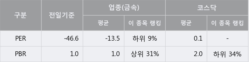 당기순이익 적자로 인해 이 종목의 PER는 마이너스이고, PBR은 1.0배이다. PER는 마이너스라서 금속업종의 평균 PER -13.5배 대비 -33.1배 낮은 수준이고, PBR은 금속업종의 평균 PBR 1.0배와 동일한 수준으로 업종 내에서 상위 31%에 위치한다.