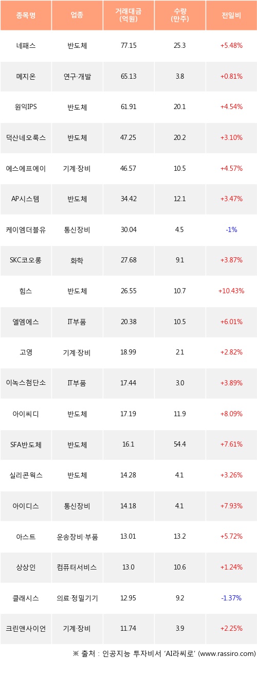 외국인 투자자의 순매수 상위 20개 종목은 네패스, 메지온, 원익IPS, 덕산네오룩스, 에스에프에이, AP시스템, 케이엠더블유, SKC코오롱PI, 힘스, 엘엠에스등이다.
