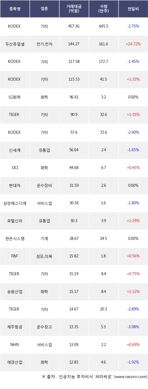 두산퓨얼셀, KODEX 200, TIGER 200 등은 전일 대비 주가가 상승했고, KODEX 200선물인버스2X, KODEX 인버스, KODEX 코스닥150선물인버스 등은 주가가 하락했다.