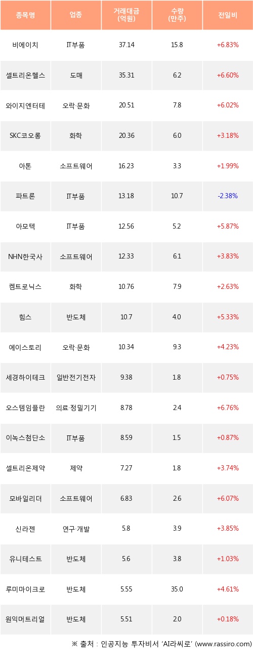 비에이치, 셀트리온헬스케어, 와이지엔터테인먼트 등은 전일 대비 주가가 상승했고, 파트론 등은 주가가 하락했다.