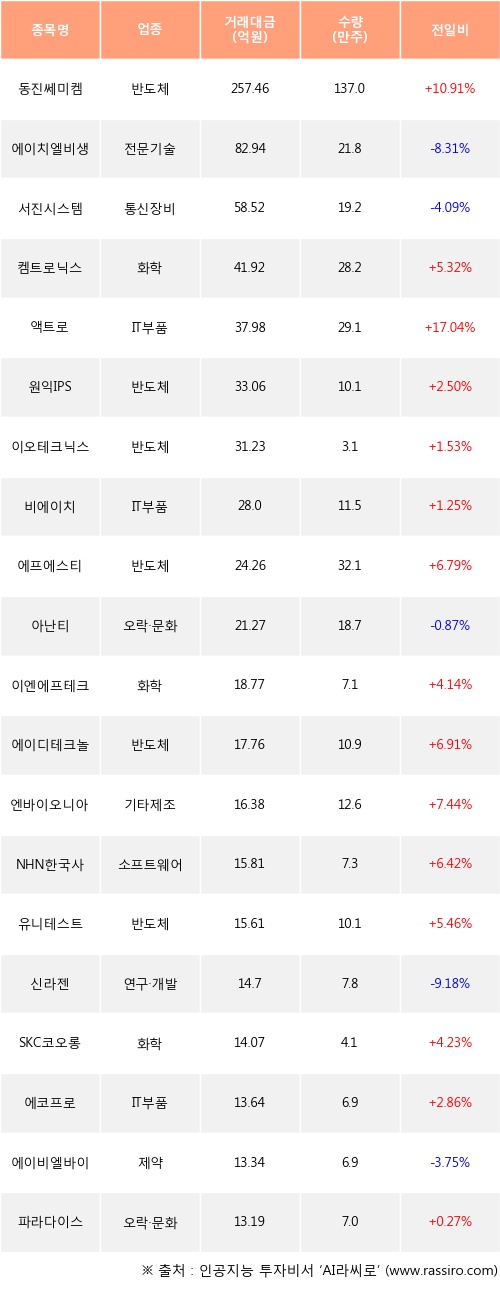 외국인 투자자의 순매수 상위 20개 종목은 동진쎄미켐, 에이치엘비생명과학, 서진시스템, 켐트로닉스, 액트로, 원익IPS, 이오테크닉스, 비에이치, 에프에스티, 아난티등이다.