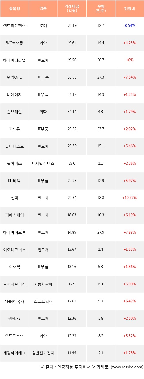기관 투자자의 순매수 상위 20개 종목은 셀트리온헬스케어, SKC코오롱PI, 하나머티리얼즈, 원익QnC, 비에이치, 솔브레인, 파트론, 유니테스트, 펄어비스, KH바텍등이다.