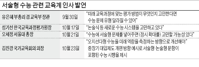 교육부는 아직까지 확실하게 정해진 것은 없다는 입장이다. 하지만 유은혜 부총리 겸 교육부 장관은 “오지선다형 수능은 미래 교육에 맞지 않는다”는 뜻을 공식적으로 여러 차례 밝혀 왔다. “미래 교육과정에 맞는 평가 방법이 무엇인지 고민한다면 수능 문제 유형이 달라질 수 있다”고도 했다. 교육부는 지난해 대입제도 개편 공론화 절차에 들어가기 전 국가교육회의에 수능 체제 개편 방향으로 논술·서술형 도입을 제시하기도 했다.