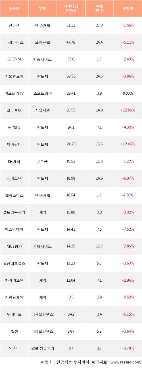 외국인 투자자의 순매수 상위 20개 종목은 신라젠, 파라다이스, CJ ENM, 서울반도체, 아프리카TV, 모두투어, 원익IPS, 아이씨디, KH바텍, 제이스텍등이다.