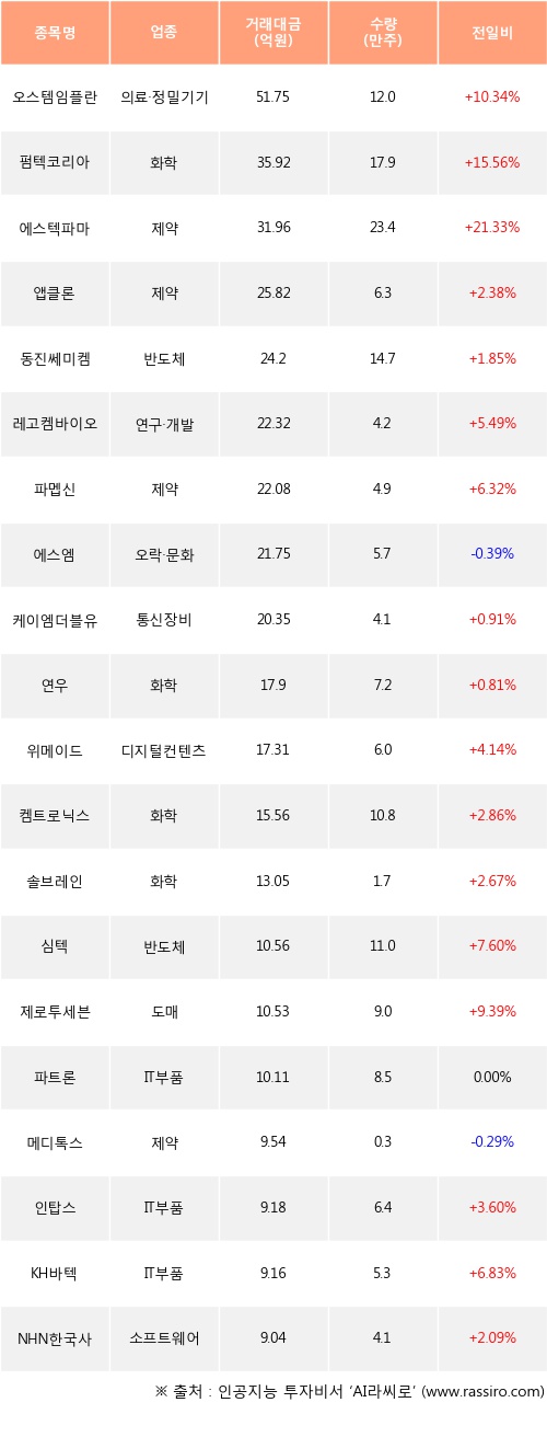 기관 투자자의 순매수 상위 20개 종목은 오스템임플란트, 펌텍코리아, 에스텍파마, 앱클론, 동진쎄미켐, 레고켐바이오, 파멥신, 에스엠, 케이엠더블유, 연우등이다.