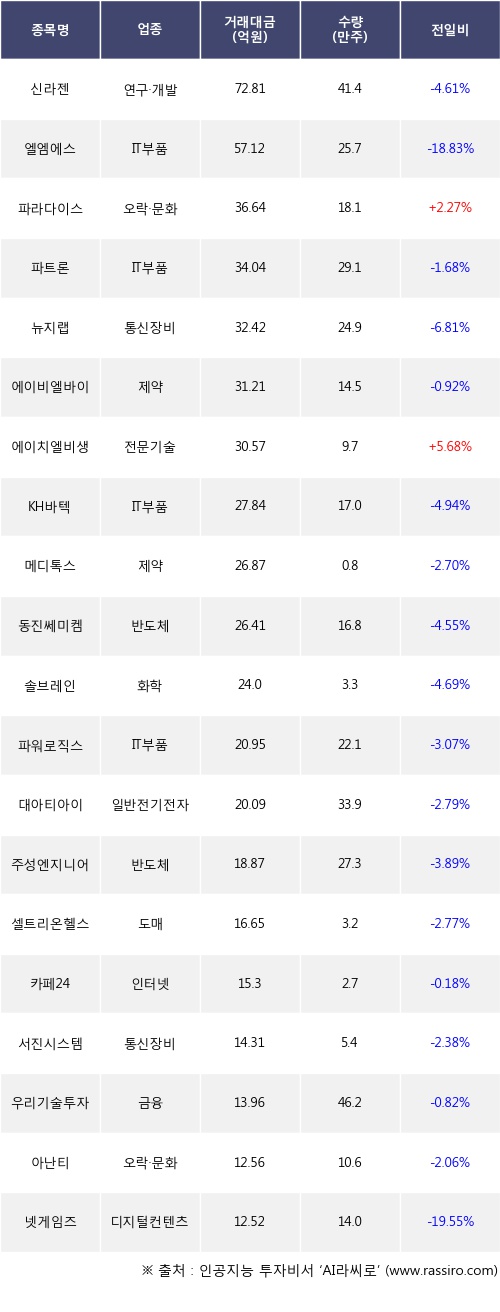 외국인 투자자의 순매도 상위 20개 종목은 신라젠, 엘엠에스, 파라다이스, 파트론, 뉴지랩, 에이비엘바이오, 에이치엘비생명과학, KH바텍, 메디톡스, 동진쎄미켐등이다.