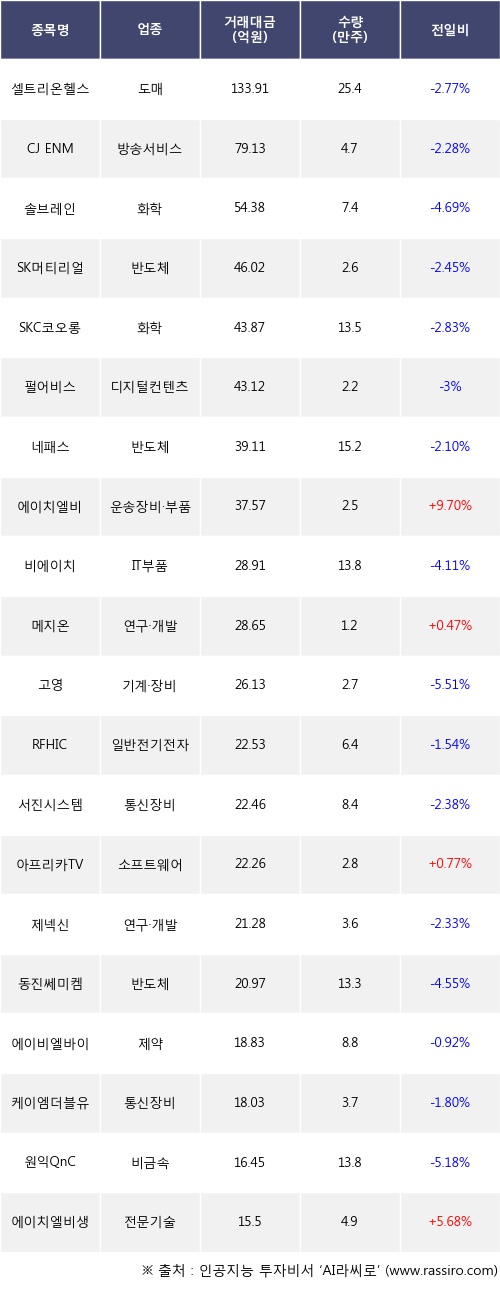 기관 투자자의 순매도 상위 20개 종목은 셀트리온헬스케어, CJ ENM, 솔브레인, SK머티리얼즈, SKC코오롱PI, 펄어비스, 네패스, 에이치엘비, 비에이치, 메지온등이다.