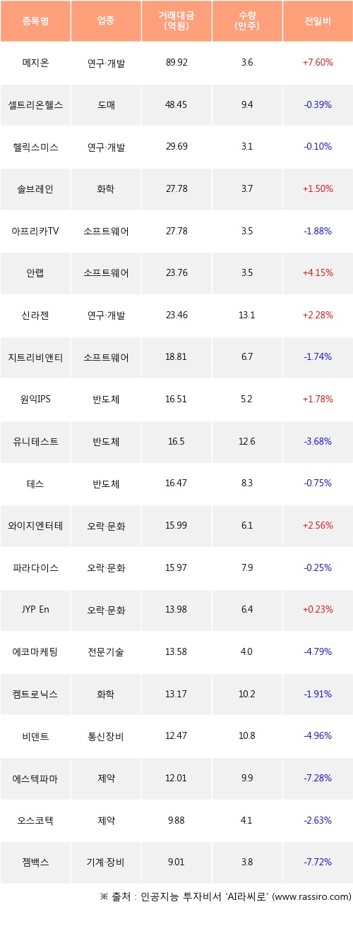 메지온, 솔브레인, 안랩 등은 전일 대비 주가가 상승했고, 셀트리온헬스케어, 헬릭스미스, 아프리카TV 등은 주가가 하락했다.