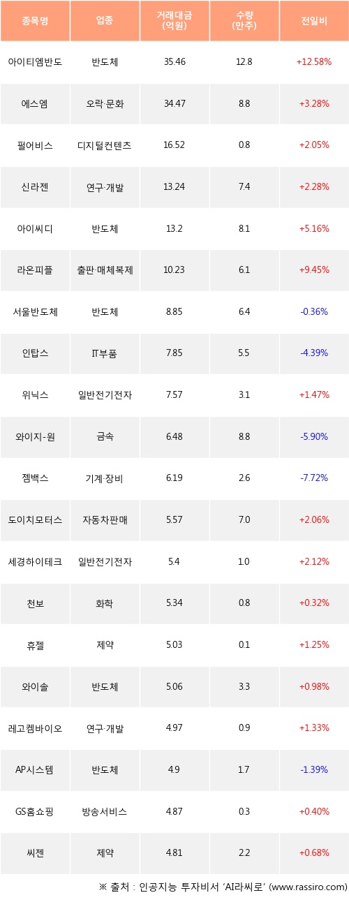 기관 투자자의 순매수 상위 20개 종목은 아이티엠반도체, 에스엠, 펄어비스, 신라젠, 아이씨디, 라온피플, 서울반도체, 인탑스, 위닉스, 와이지-원등이다.