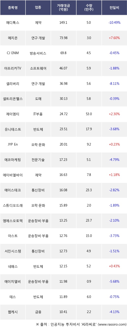 기관 투자자의 순매도 상위 20개 종목은 메디톡스, 메지온, CJ ENM, 아프리카TV, 셀리버리, 셀트리온헬스케어, 제이엠티, 유니테스트, JYP Ent., 에코마케팅등이다.