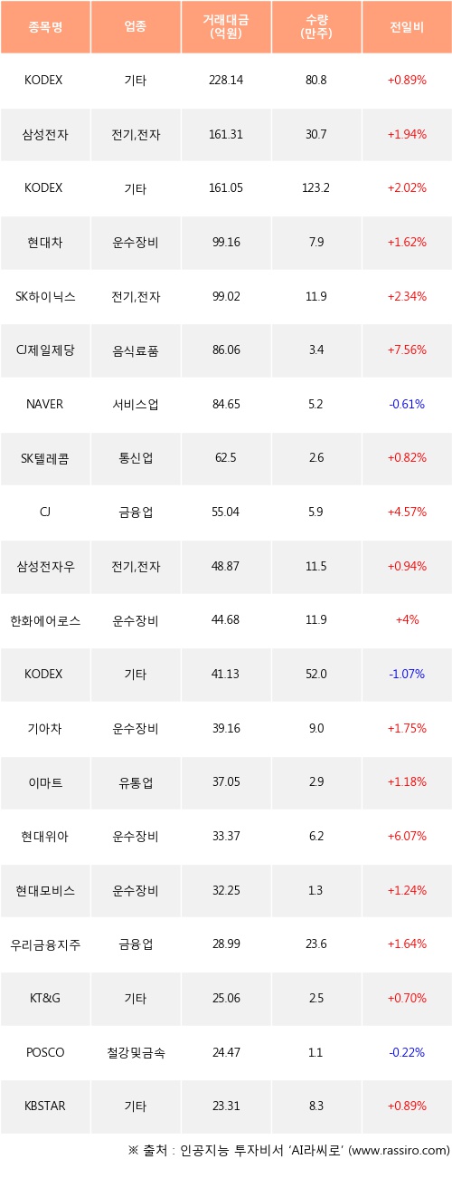 기관 투자자의 순매수 상위 20개 종목은 KODEX 200, 삼성전자, KODEX 레버리지, 현대차, SK하이닉스, CJ제일제당, NAVER, SK텔레콤, CJ, 삼성전자우등이다.