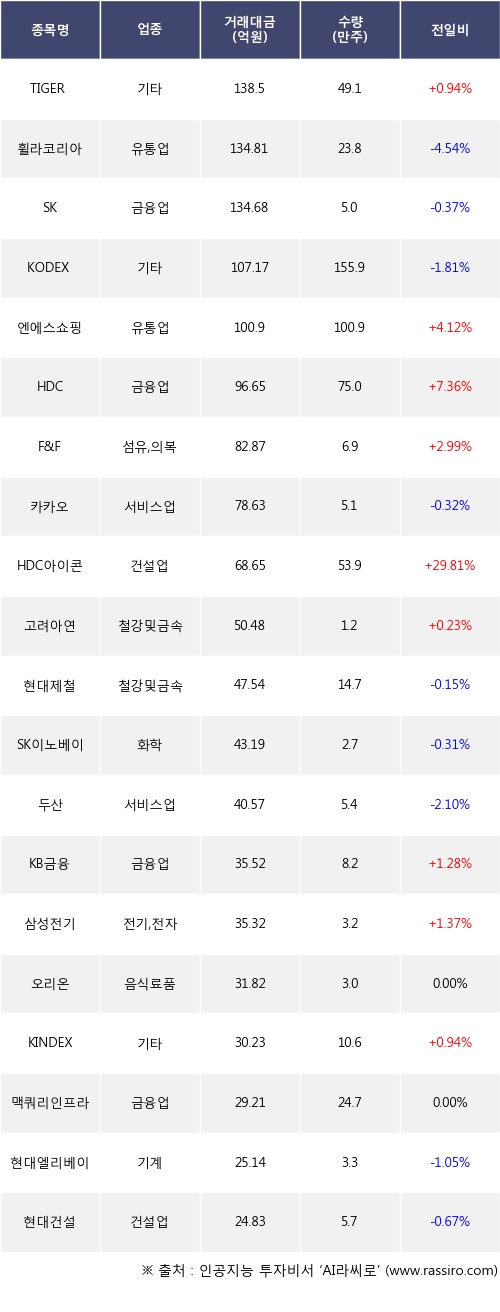 TIGER 200, 엔에스쇼핑, HDC 등은 전일 대비 주가가 상승했고, 휠라코리아, SK, KODEX 200선물인버스2X 등은 주가가 하락했다.
