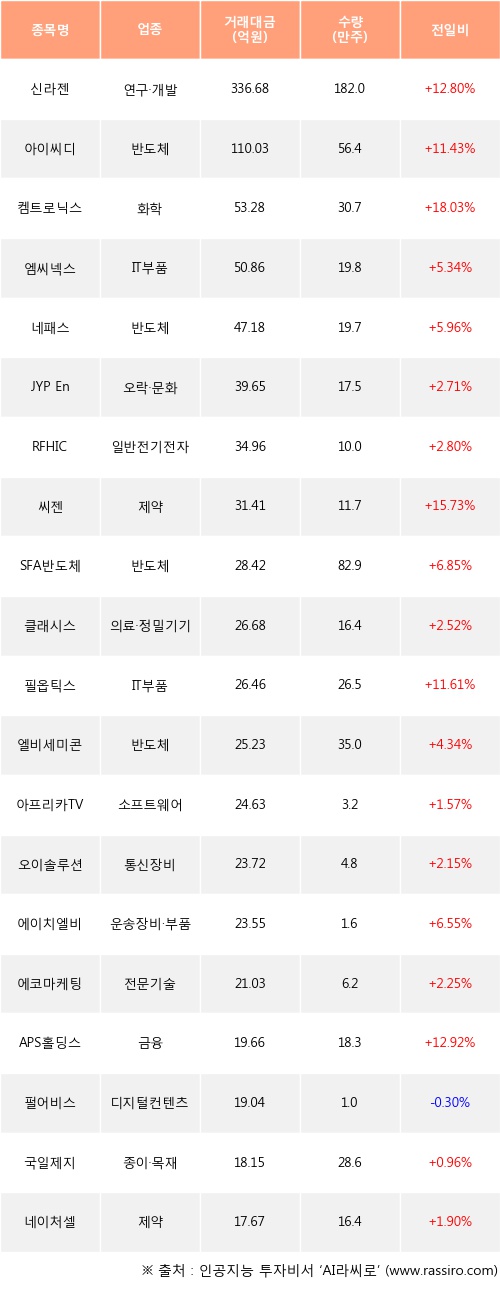 외국인 투자자의 순매수 상위 20개 종목은 신라젠, 아이씨디, 켐트로닉스, 엠씨넥스, 네패스, JYP Ent., RFHIC, 씨젠, SFA반도체, 클래시스등이다.