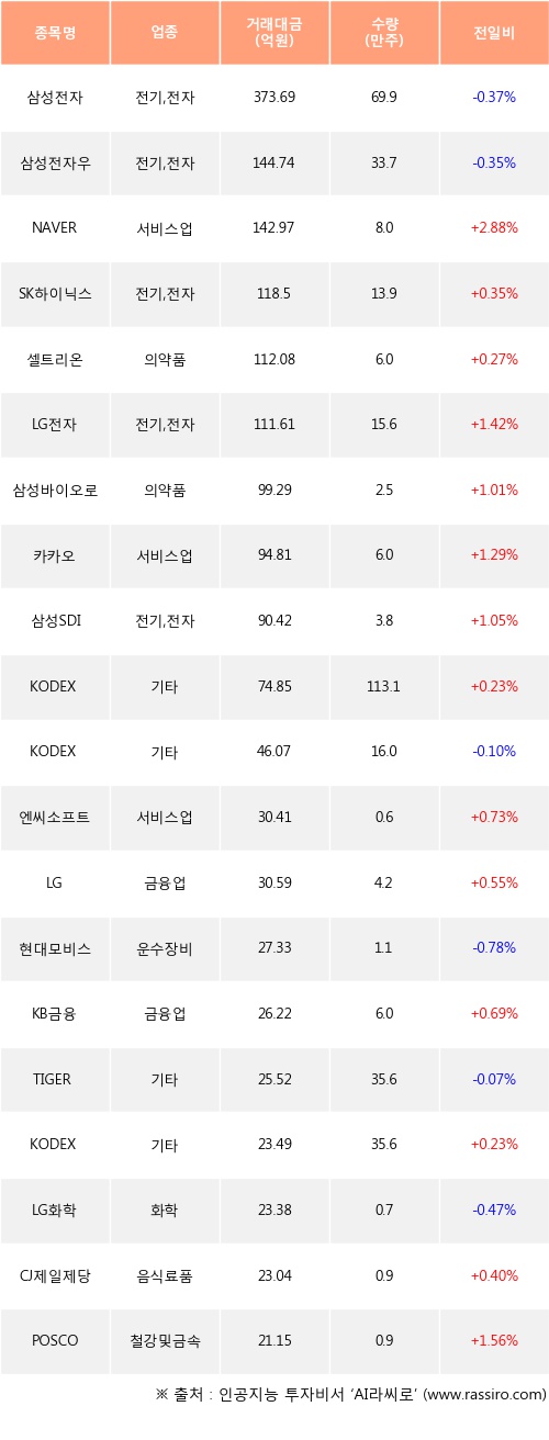 NAVER, SK하이닉스, 셀트리온 등은 전일 대비 주가가 상승했고, 삼성전자, 삼성전자우, KODEX 200 등은 주가가 하락했다.