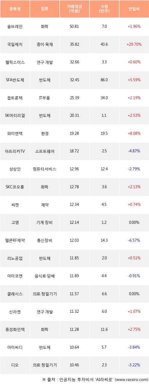 외국인 투자자의 순매수 상위 20개 종목은 솔브레인, 국일제지, 헬릭스미스, SFA반도체, 옵트론텍, SK머티리얼즈, 와이엔텍, 아프리카TV, 상상인, SKC코오롱PI등이다.