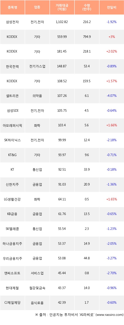 KODEX 200선물인버스2X, KODEX 코스닥150선물인버스, KODEX 인버스 등은 전일 대비 주가가 상승했고, 삼성전자, 한국전력, 셀트리온 등은 주가가 하락했다.