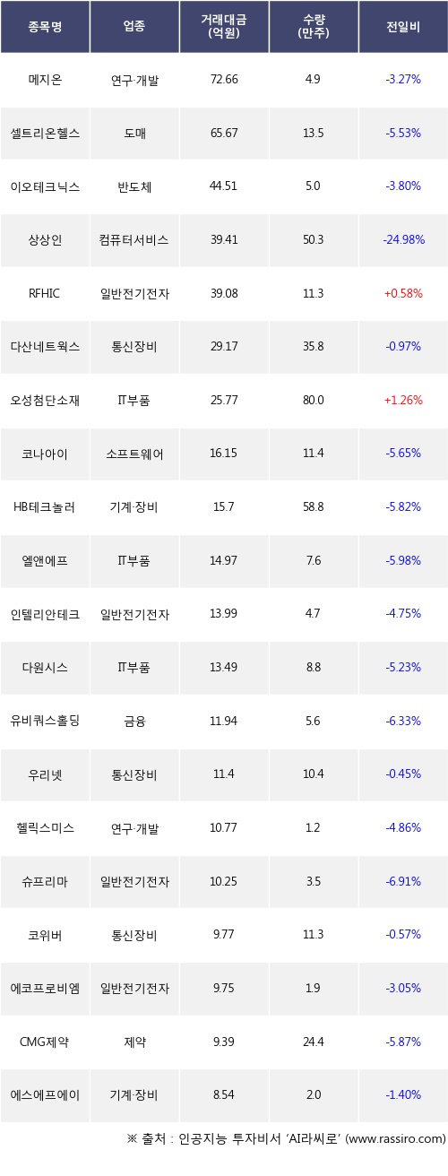 외국인 투자자의 순매도 상위 20개 종목은 메지온, 셀트리온헬스케어, 이오테크닉스, 상상인, RFHIC, 다산네트웍스, 오성첨단소재, 코나아이, HB테크놀러지, 엘앤에프등이다.