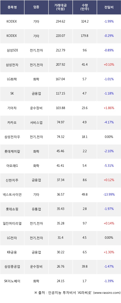 삼성전자, 기아차, 신한 인버스 2X WTI원유 선물 ETN(H) 등은 전일 대비 주가가 상승했고, KODEX 코스닥150 레버리지, KODEX 레버리지, 삼성SDI 등은 주가가 하락했다.