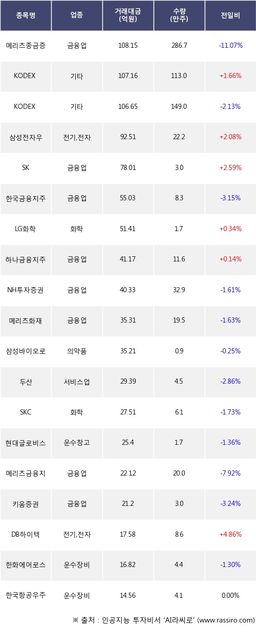 KODEX 코스닥 150, 삼성전자우, SK 등은 전일 대비 주가가 상승했고, 메리츠종금증권, KODEX 200선물인버스2X, 한국금융지주 등은 주가가 하락했다.