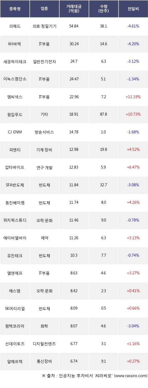 기관 투자자의 순매도 상위 20개 종목은 리메드, KH바텍, 세경하이테크, 이녹스첨단소재, 엠씨넥스, 윙입푸드, CJ ENM, 피엔티, 압타바이오, SFA반도체등이다.