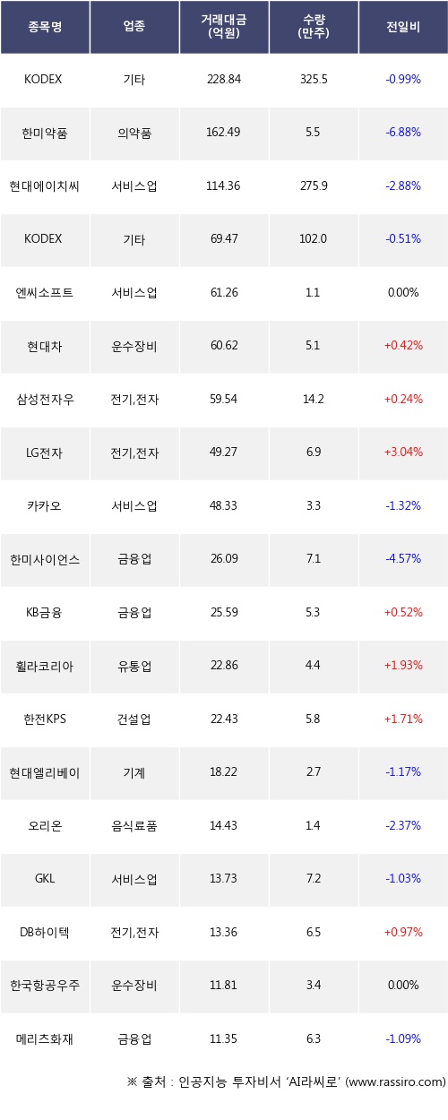 현대차, 삼성전자우, LG전자 등은 전일 대비 주가가 상승했고, KODEX 200선물인버스2X, 한미약품, 현대에이치씨엔 등은 주가가 하락했다.