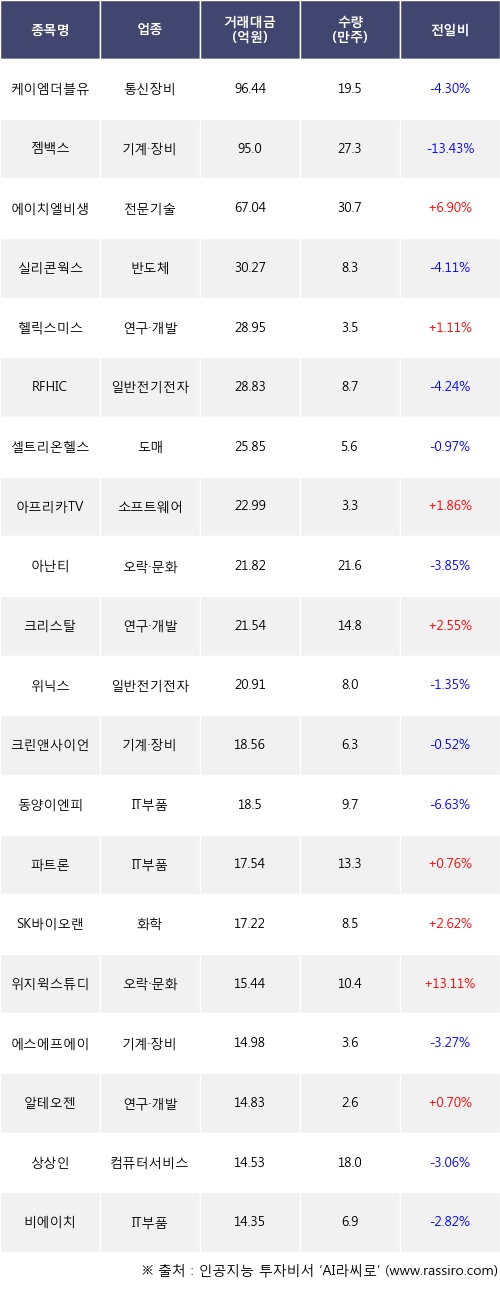 에이치엘비생명과학, 헬릭스미스, 아프리카TV 등은 전일 대비 주가가 상승했고, 케이엠더블유, 젬백스, 실리콘웍스 등은 주가가 하락했다.