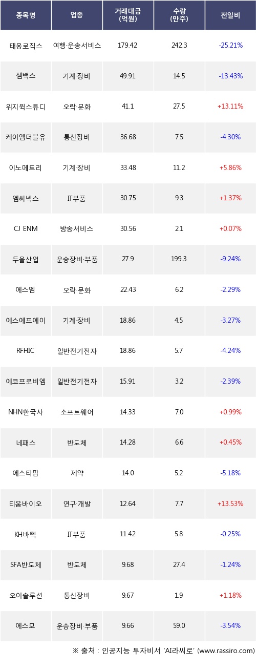 기관 투자자의 순매도 상위 20개 종목은 태웅로직스, 젬백스, 위지윅스튜디오, 케이엠더블유, 이노메트리, 엠씨넥스, CJ ENM, 두올산업, 에스엠, 에스에프에이등이다.