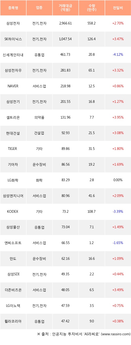 삼성전자, SK하이닉스, 삼성전자우 등은 전일 대비 주가가 상승했고, 신세계인터내셔날, KODEX 200선물인버스2X, 엔씨소프트 등은 주가가 하락했다.