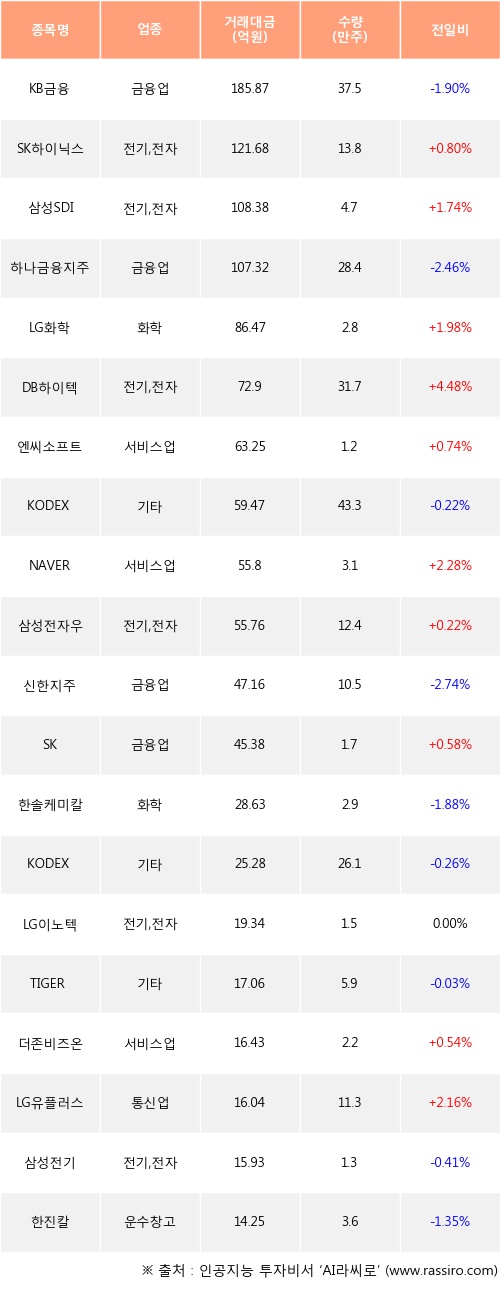 외국인 투자자의 순매수 상위 20개 종목은 KB금융, SK하이닉스, 삼성SDI, 하나금융지주, LG화학, DB하이텍, 엔씨소프트, KODEX 레버리지, NAVER, 삼성전자우등이다.