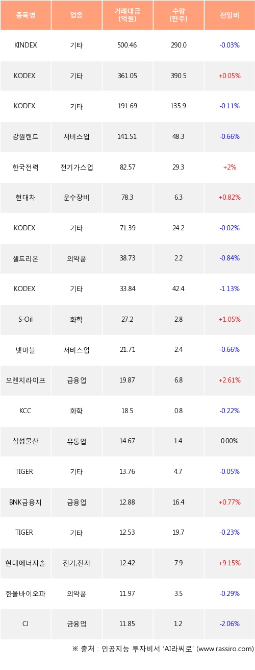 KODEX MSCI Korea TR, 한국전력, 현대차 등은 전일 대비 주가가 상승했고, KINDEX 200TR, KODEX 레버리지, 강원랜드 등은 주가가 하락했다.