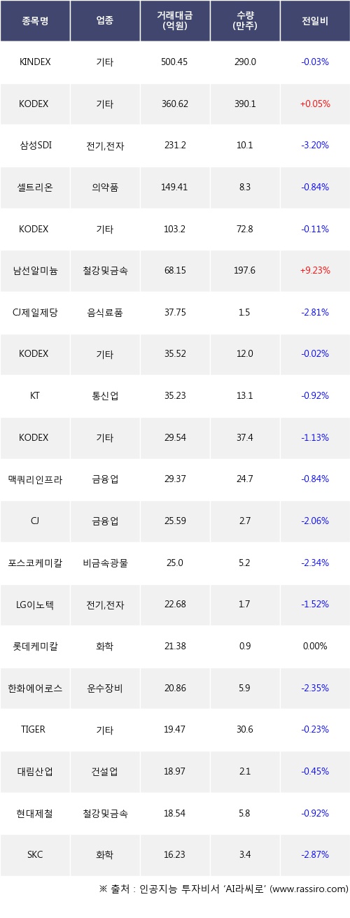 외국인 투자자의 순매도 상위 20개 종목은 KINDEX 200TR, KODEX MSCI Korea TR, 삼성SDI, 셀트리온, KODEX 레버리지, 남선알미늄, CJ제일제당, KODEX 200, KT, KODEX 코스닥150 레버리지등이다.