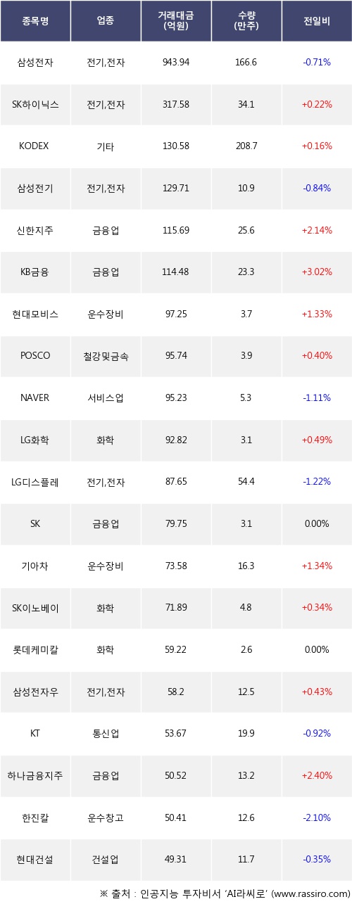 SK하이닉스, KODEX 200선물인버스2X, 신한지주 등은 전일 대비 주가가 상승했고, 삼성전자, 삼성전기, NAVER 등은 주가가 하락했다.