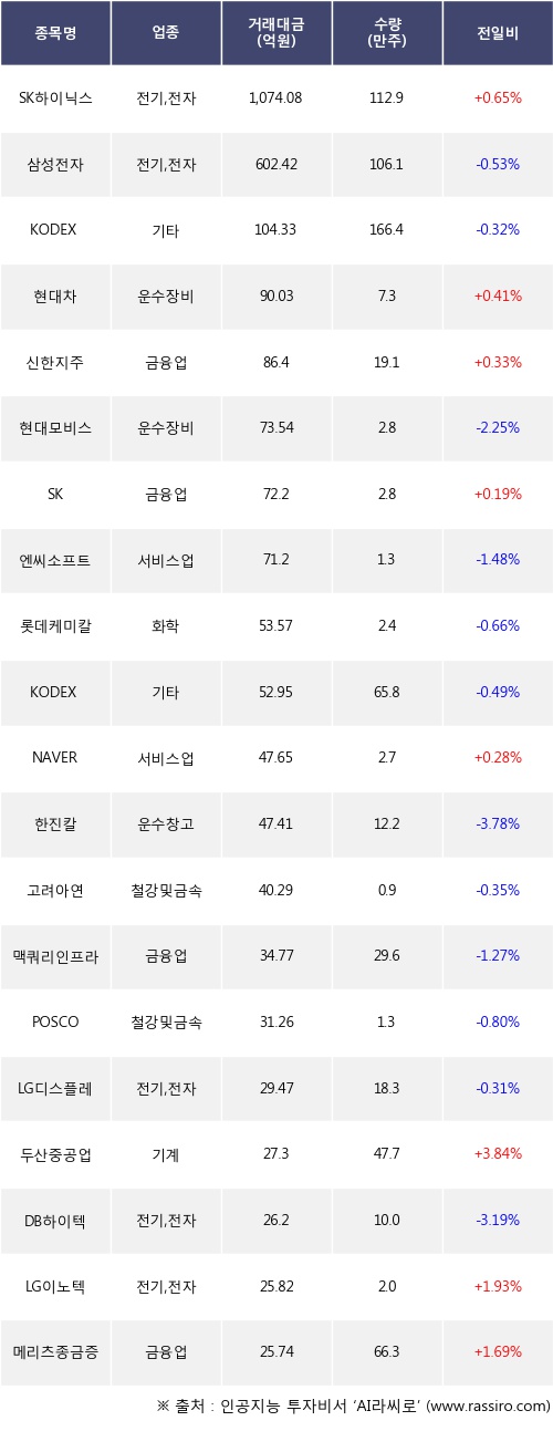 SK하이닉스, 현대차, 신한지주 등은 전일 대비 주가가 상승했고, 삼성전자, KODEX 200선물인버스2X, 현대모비스 등은 주가가 하락했다.