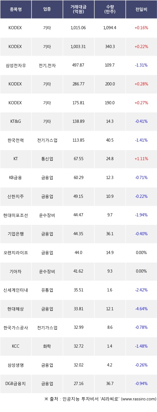 KODEX 200TR, KODEX 200, KODEX Top5PlusTR 등은 전일 대비 주가가 상승했고, 삼성전자우, KT&G, 한국전력 등은 주가가 하락했다.