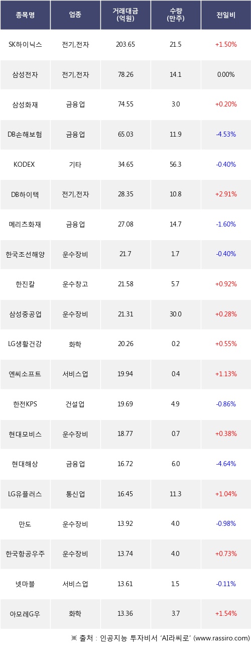SK하이닉스, 삼성화재, DB하이텍 등은 전일 대비 주가가 상승했고, DB손해보험, KODEX 200선물인버스2X, 메리츠화재 등은 주가가 하락했다.