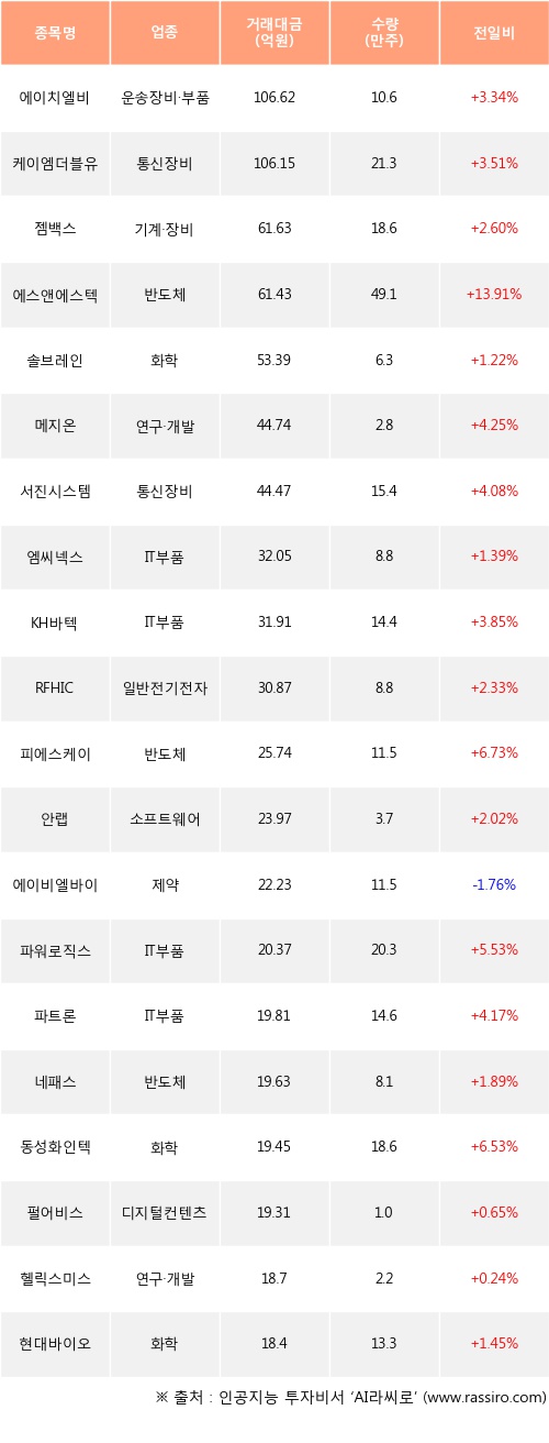 외국인 투자자의 순매수 상위 20개 종목은 에이치엘비, 케이엠더블유, 젬백스, 에스앤에스텍, 솔브레인, 메지온, 서진시스템, 엠씨넥스, KH바텍, RFHIC등이다.