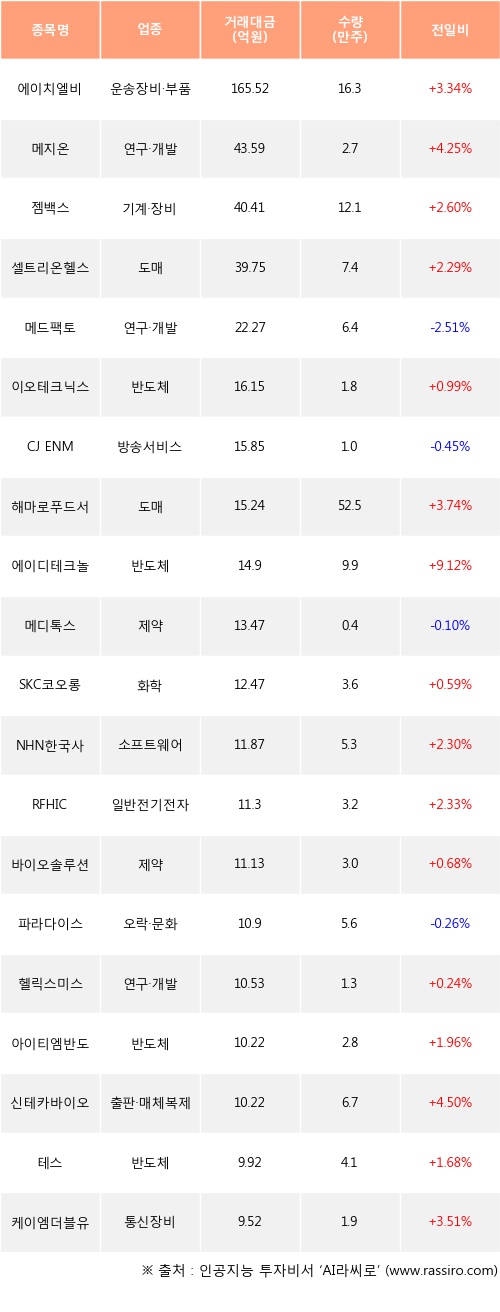 기관 투자자의 순매수 상위 20개 종목은 에이치엘비, 메지온, 젬백스, 셀트리온헬스케어, 메드팩토, 이오테크닉스, CJ ENM, 해마로푸드서비스, 에이디테크놀로지, 메디톡스등이다.