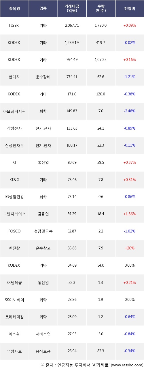 TIGER MSCI Korea TR, KODEX 200TR, KT 등은 전일 대비 주가가 상승했고, KODEX 200, 현대차, KODEX Top5PlusTR 등은 주가가 하락했다.
