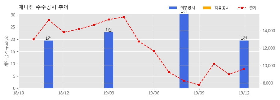 계약 상대방은 (주)에빅스젠이고, 계약금액은 8억원 규모로 최근 애니젠 매출액 41.1억원 대비 약 19.47% 수준이다. 이번 계약의 기간은 2019년 12월 23일 부터 2020년 03월 24일까지로 약 3개월이다.